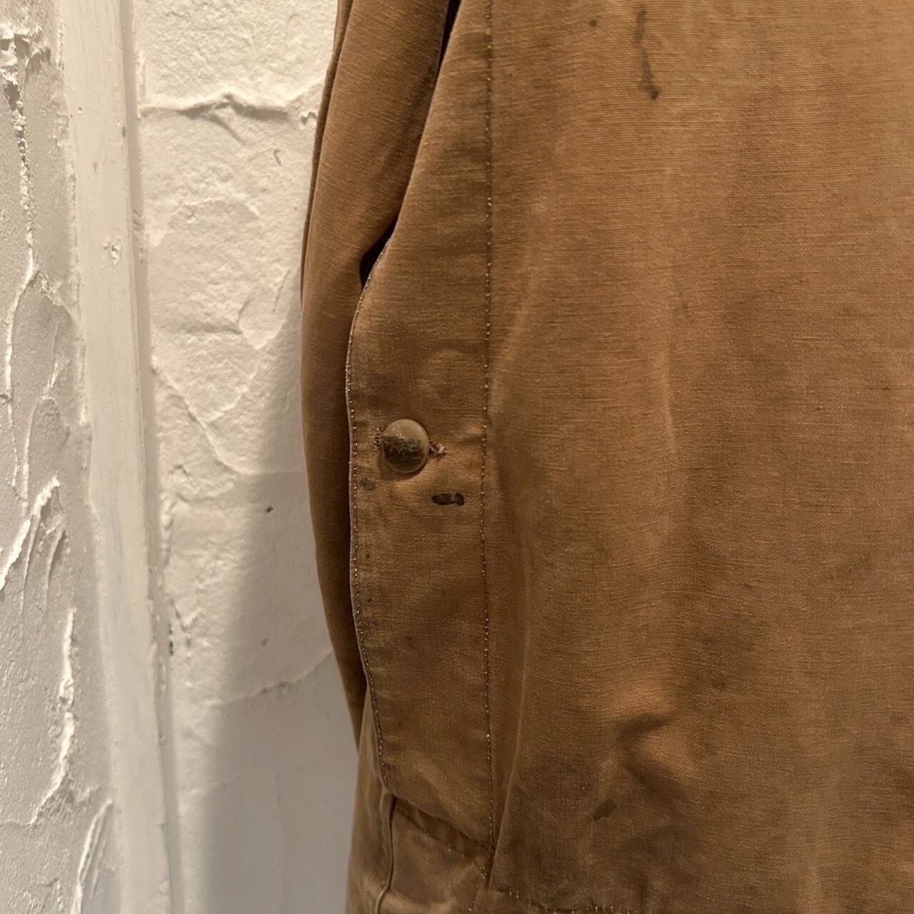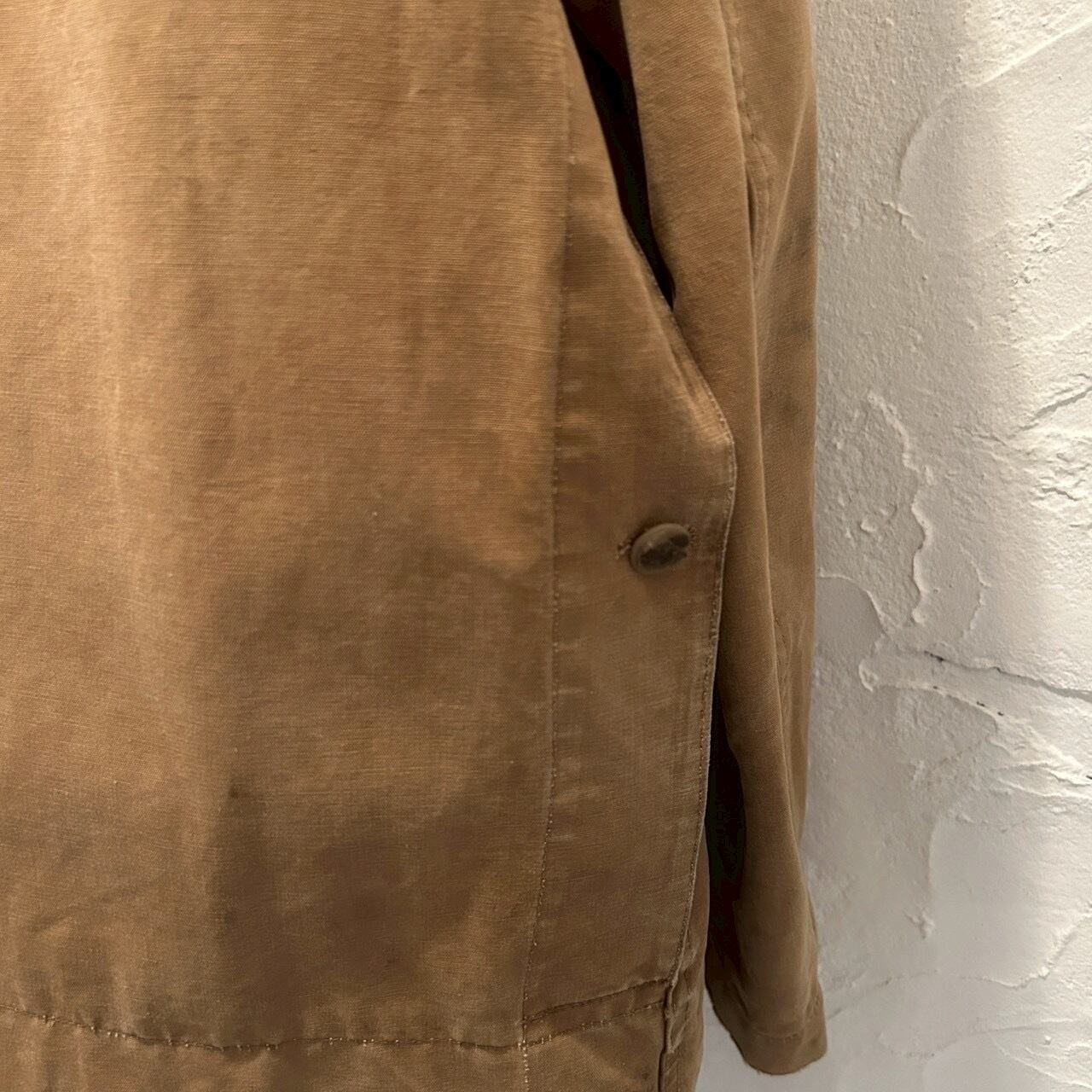 しっかり作られた平織りコットン。ガシガシではなく柔らかめで体に馴染む生地感。所々に起毛がみられ、ややモールスキンっぽさも感じられます。