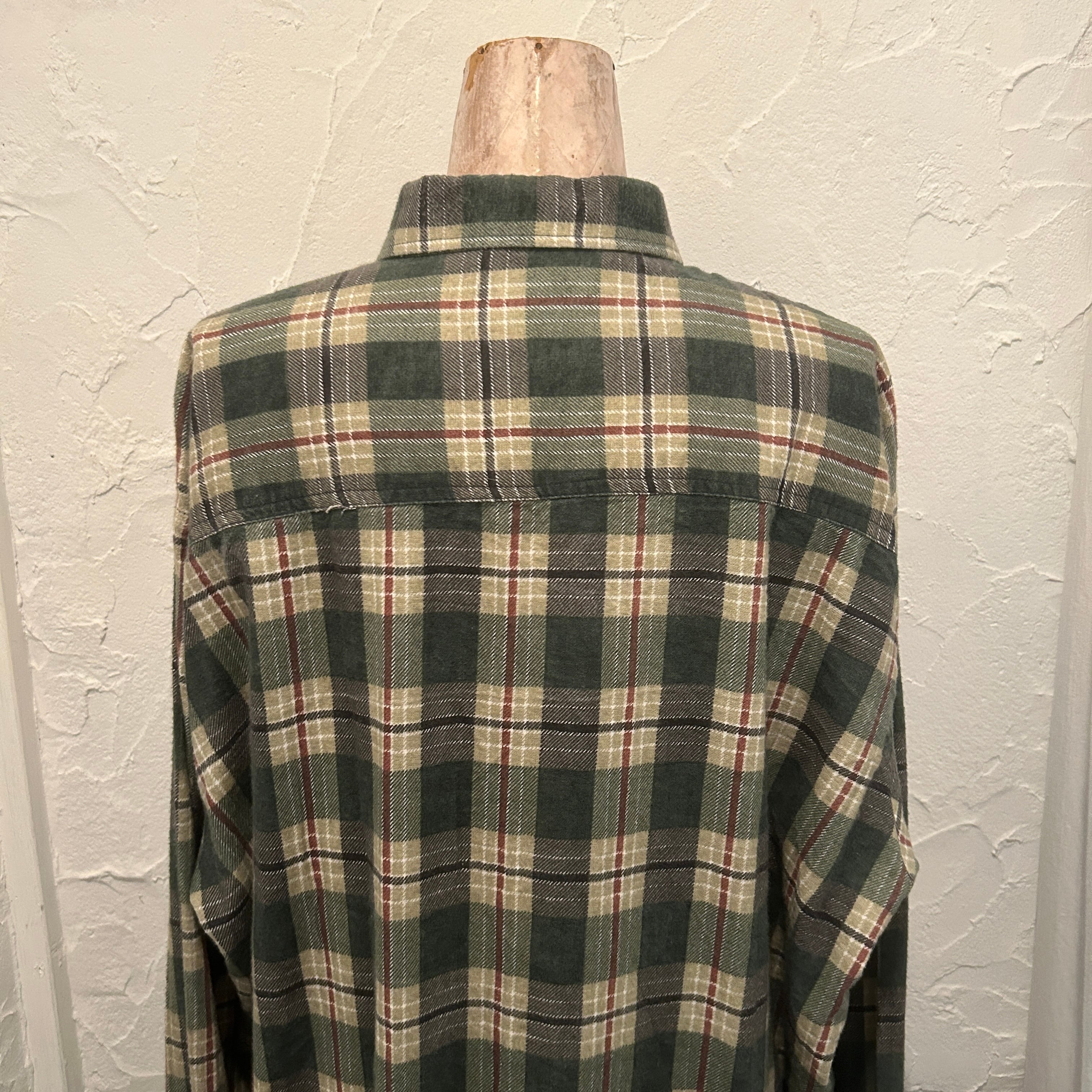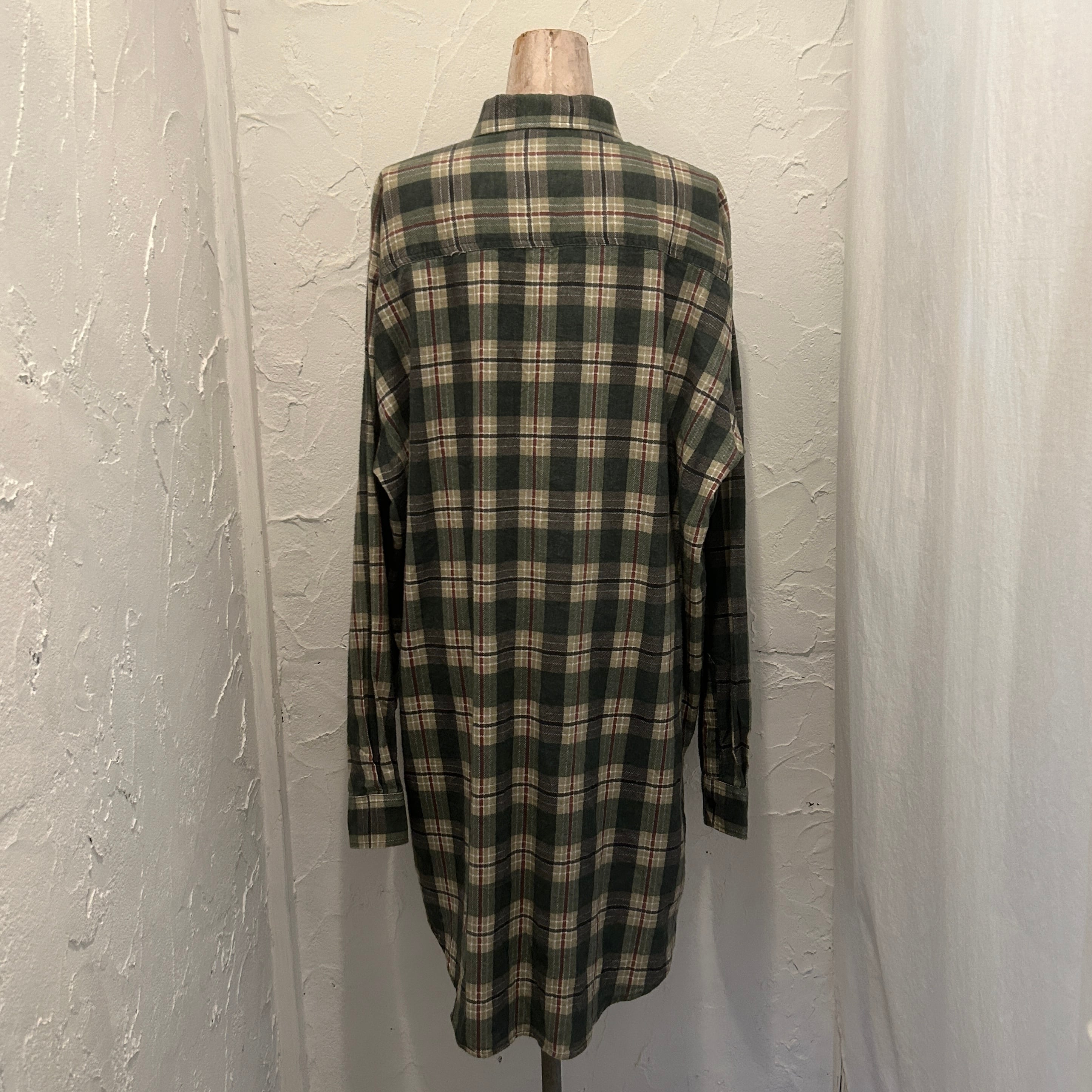 深みのあるグリーンに、ネイビー・ワインレッドが柔らかく混ざり合った、温かみのあるチェック柄グランパシャツ。