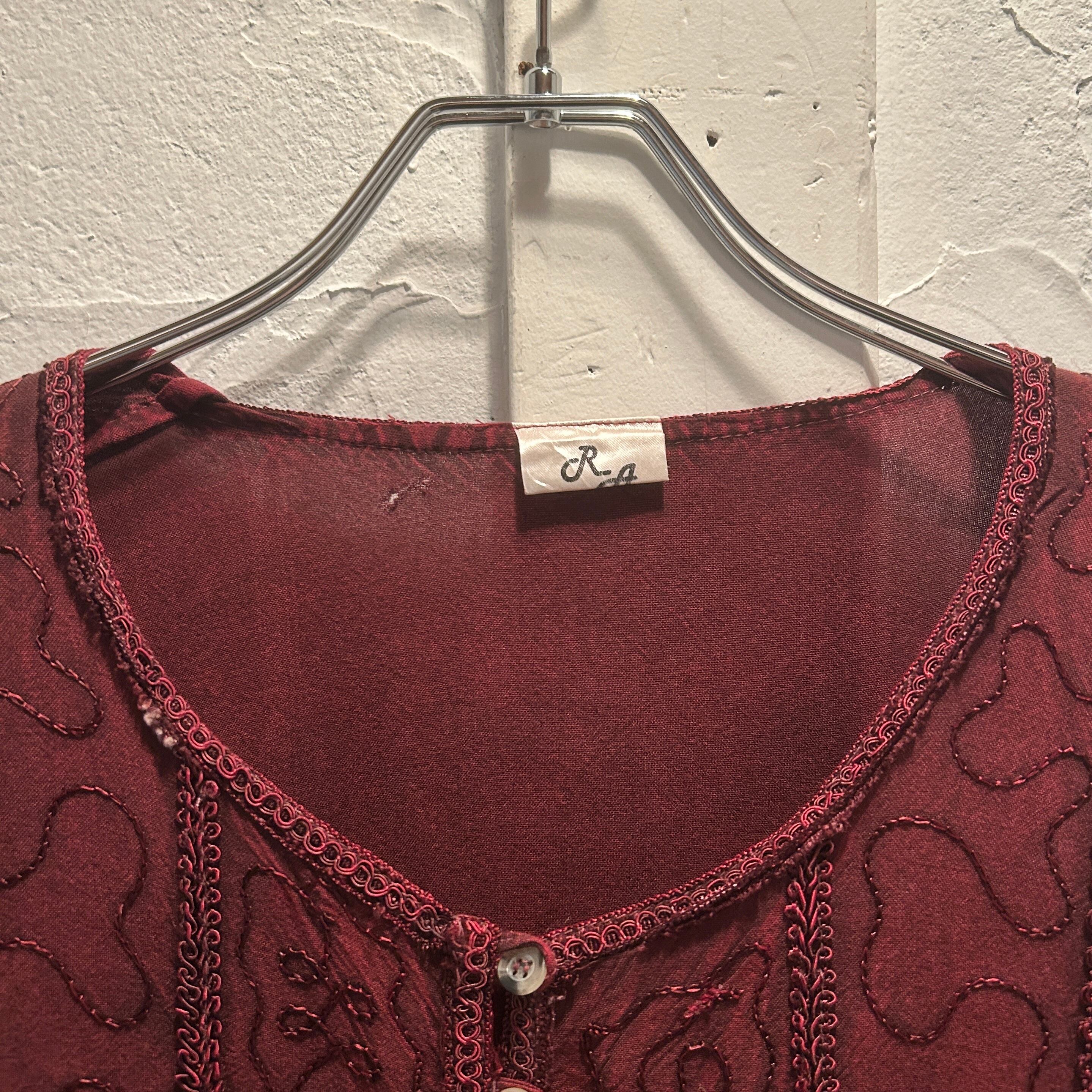 前身頃全体に施された立体的なステッチ刺繍は、民族衣装のようなフォークロアな空気感を纏い、古着好きにはたまらないディテール。
