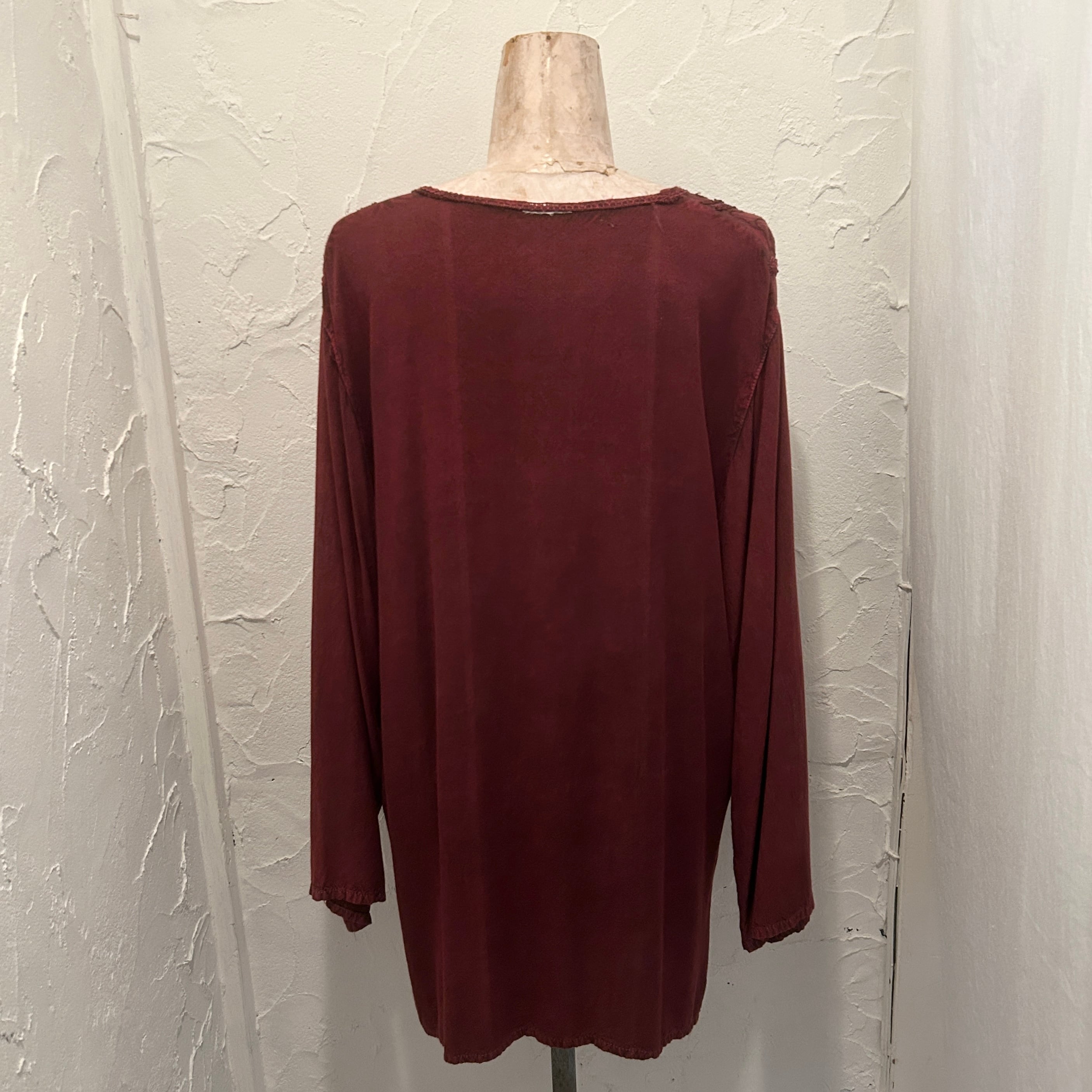 深みのあるボルドーカラーに繊細な刺繍が映える、ボタニカルムード漂うロングカーディガン。
