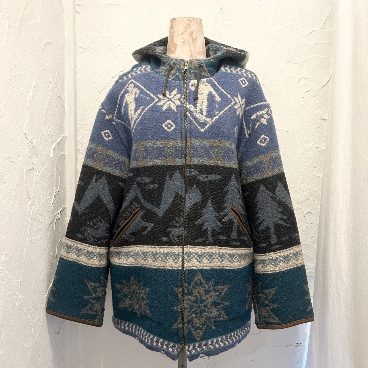 ブルー〜グリーンを基調とした落ち着いた配色に、雪の結晶や山・木のモチーフが織り込まれた、雰囲気たっぷりの一着です。