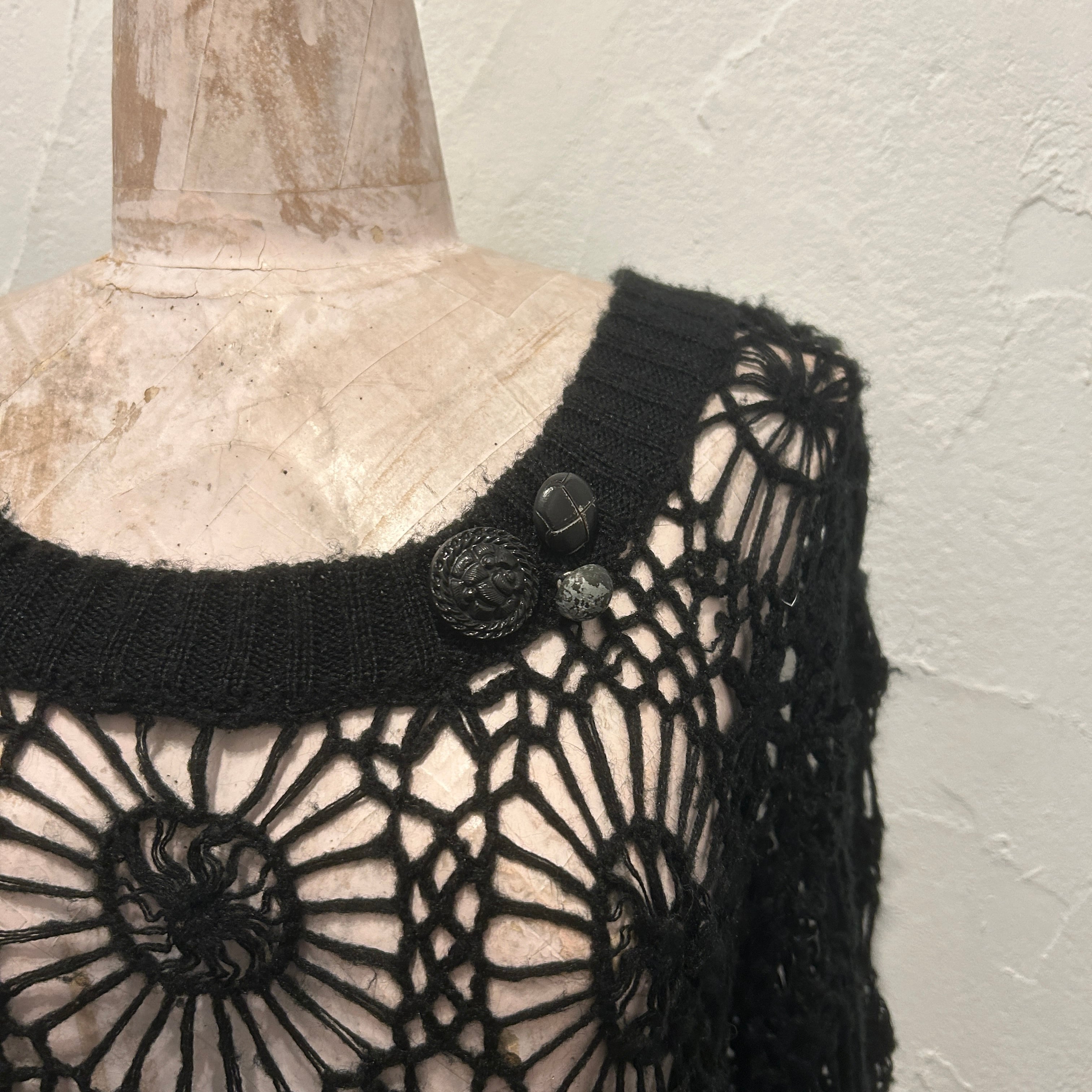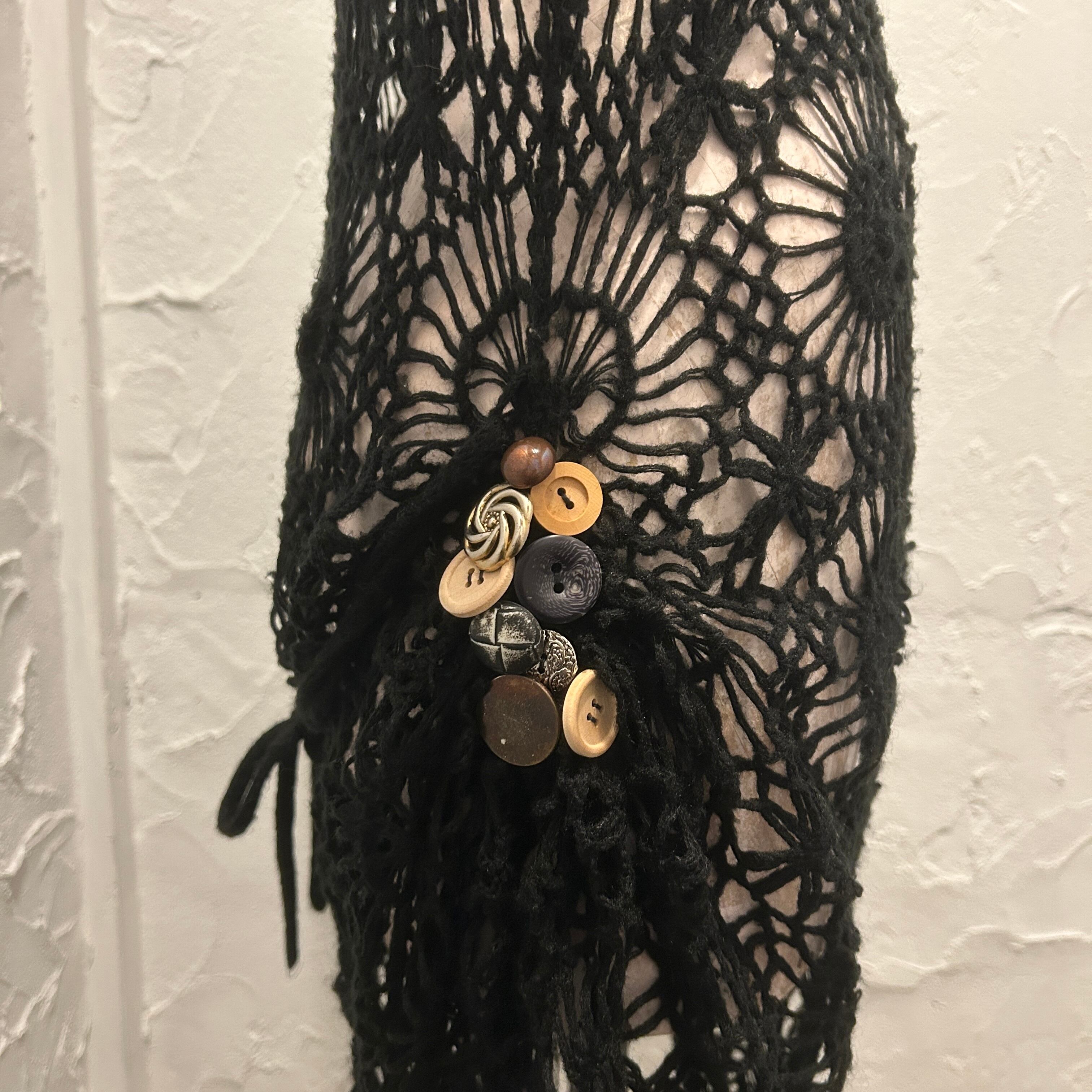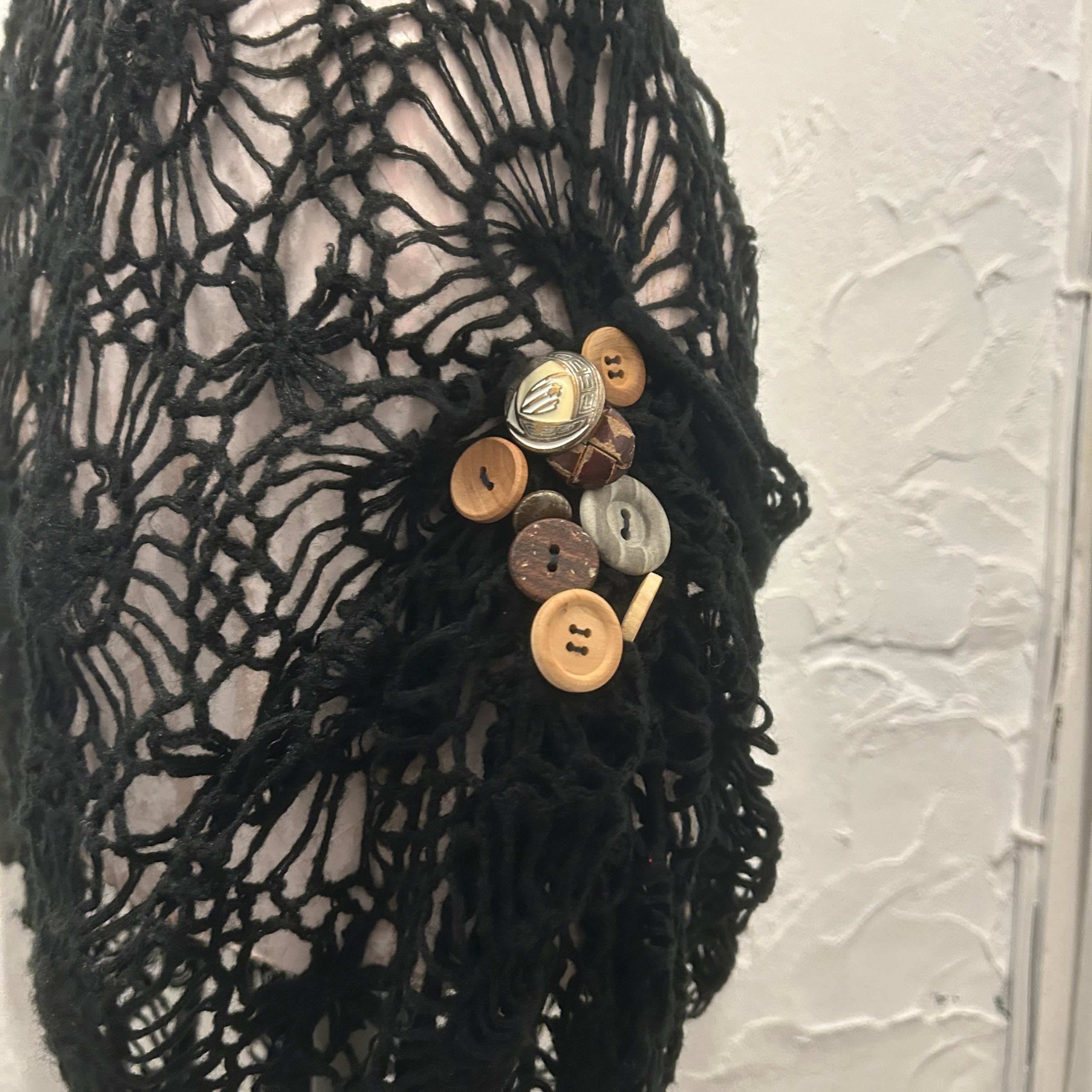 ネックラインやサイドには異なる素材・表情のボタンをランダムに配置し、